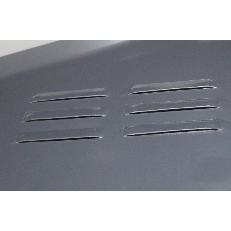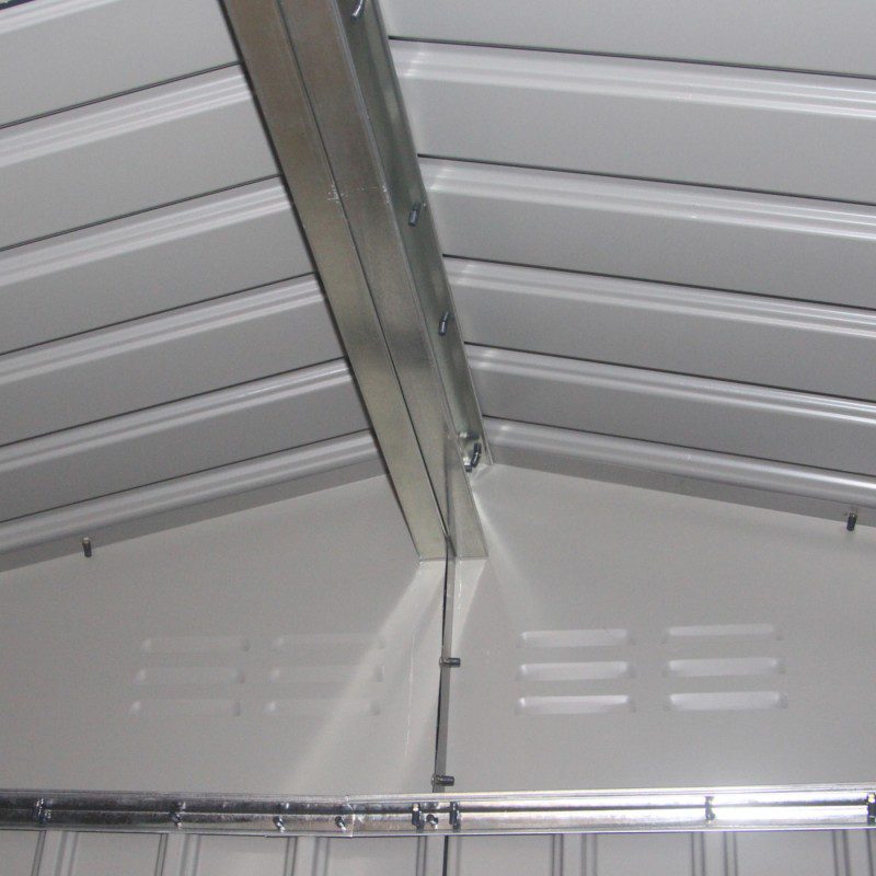 Petite distinction esthétique et fonctionnelle, les grilles de ventilation sont directement découpées dans les triangles de toit ! Elles assurent un renouvellement de l’air à l’intérieur de l’abri de jardin en métal, même quand vous n’ouvrez pas les portes pendant longtemps.